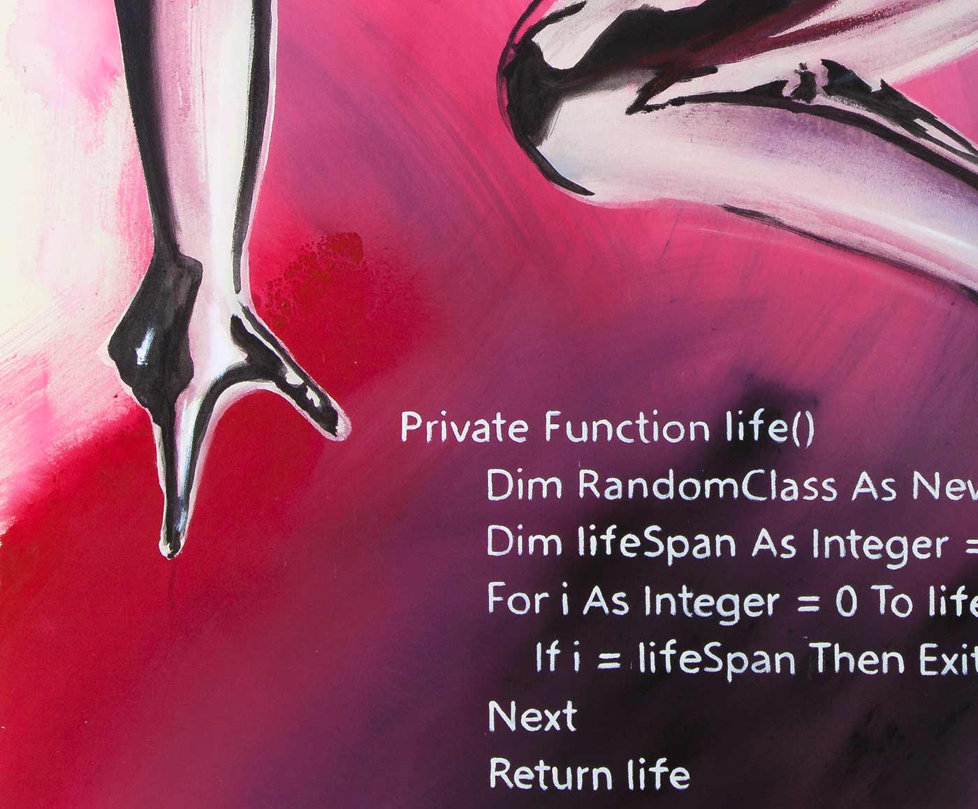 This is the world’s first painting encompassing computer code as part of the theme. What does the code describe? We are all given a random time to live. Presumably between 0 and 150 years. When our time is up, the function is spent and life returned. Without any religious connotation we humans have a sense of justice. Still, we are floating in the universe trying to understand our very existence. Is someone watching over us? Or are we just life for a fleeting moment?